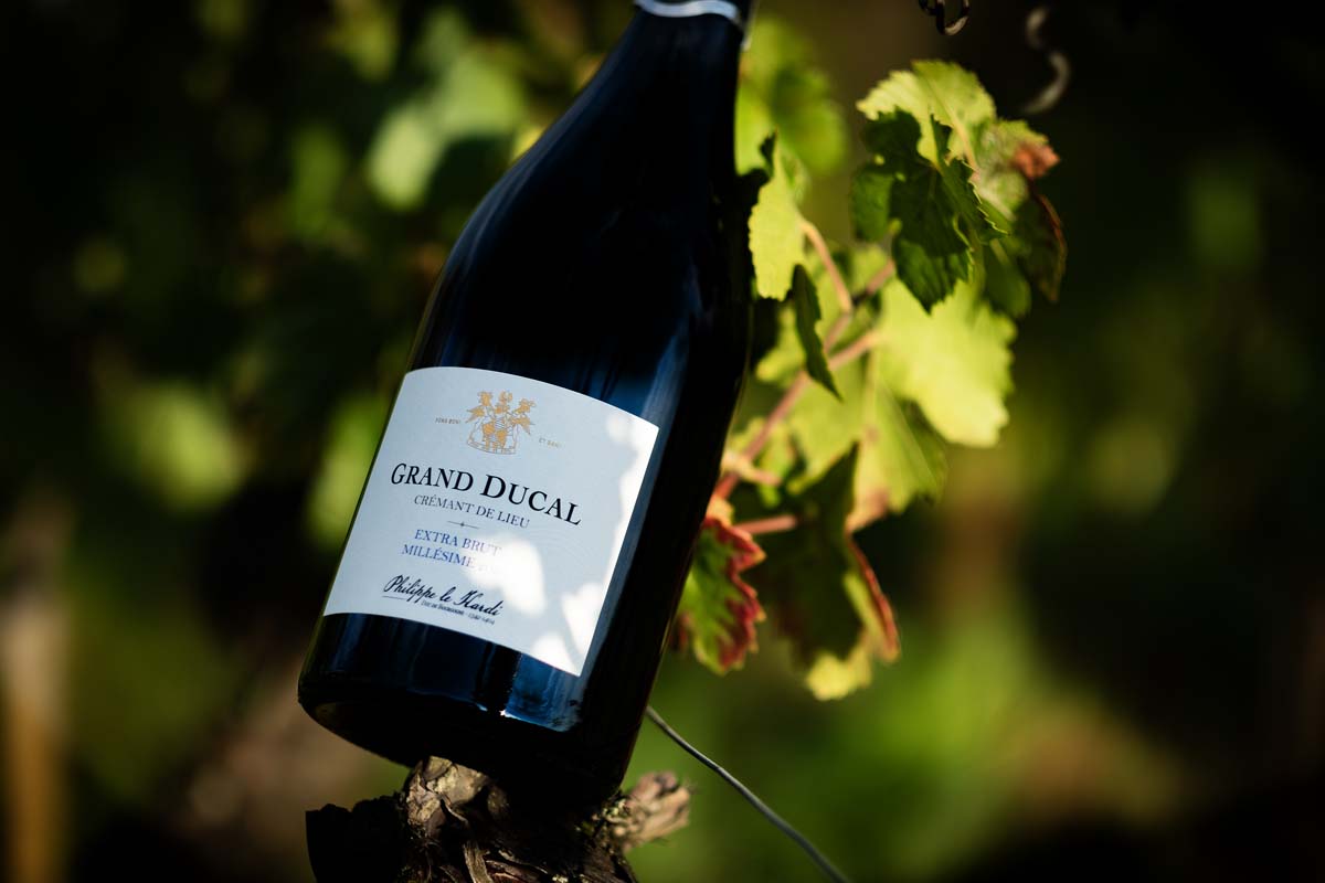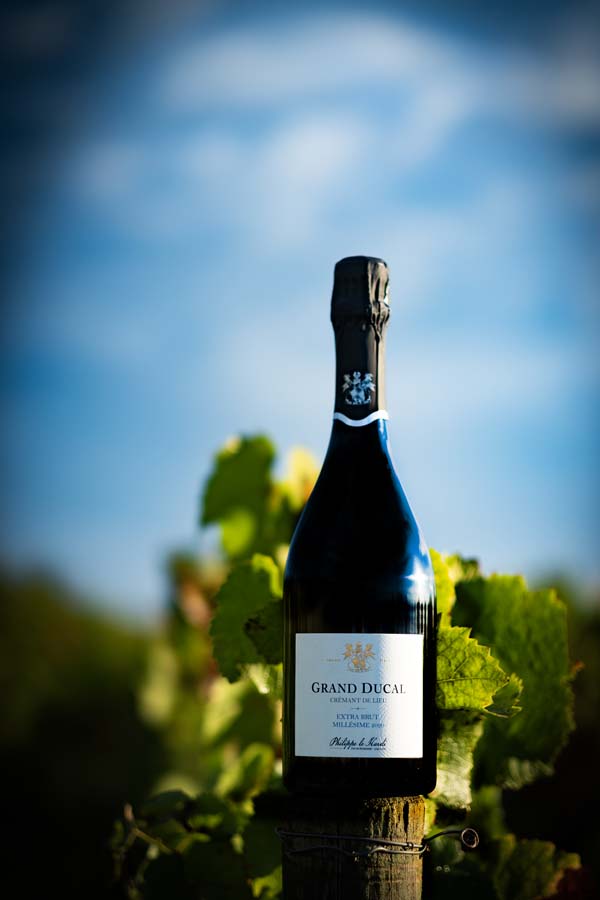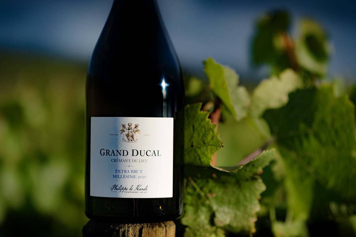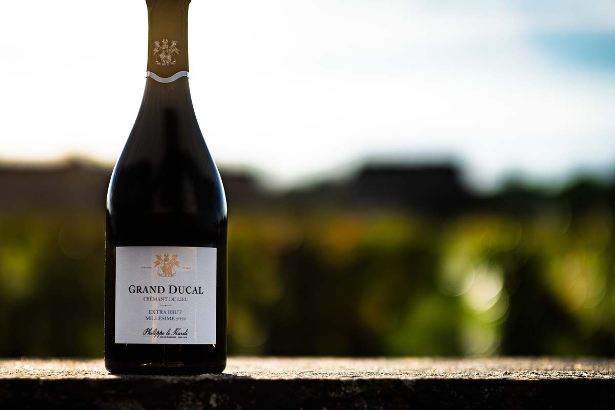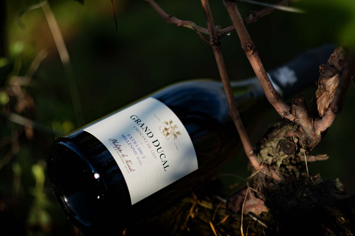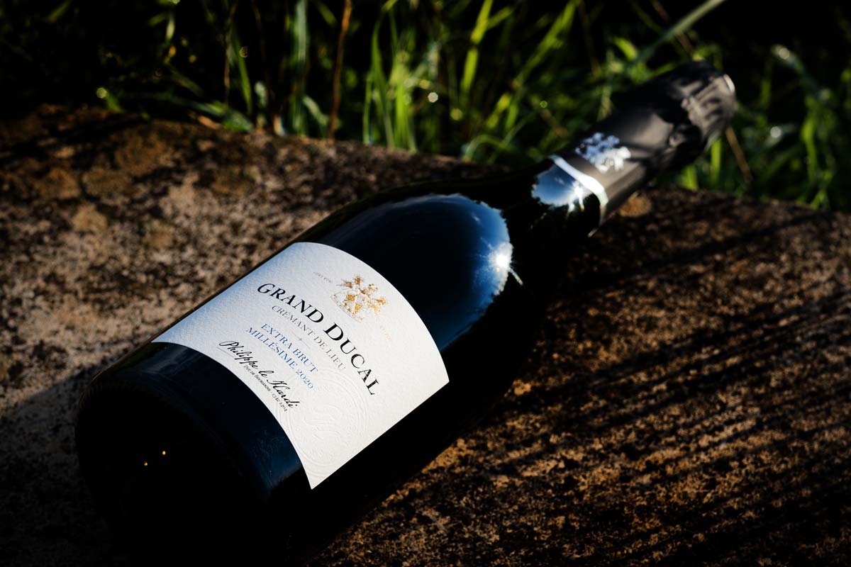Cette création packaging est empreinre de sobriété, avec une étiquette finement décorée par le foulage d’un badge du Domaine en relief, un blason en or à chaud qui contraste avec les typographies à la fois puissantes et intemporelles de Grand Ducal. Une touche de bleu intense pour les mots Extra Brut et le Millésime 2020 donne enfin une pointe contemporaine à l’ensemble.